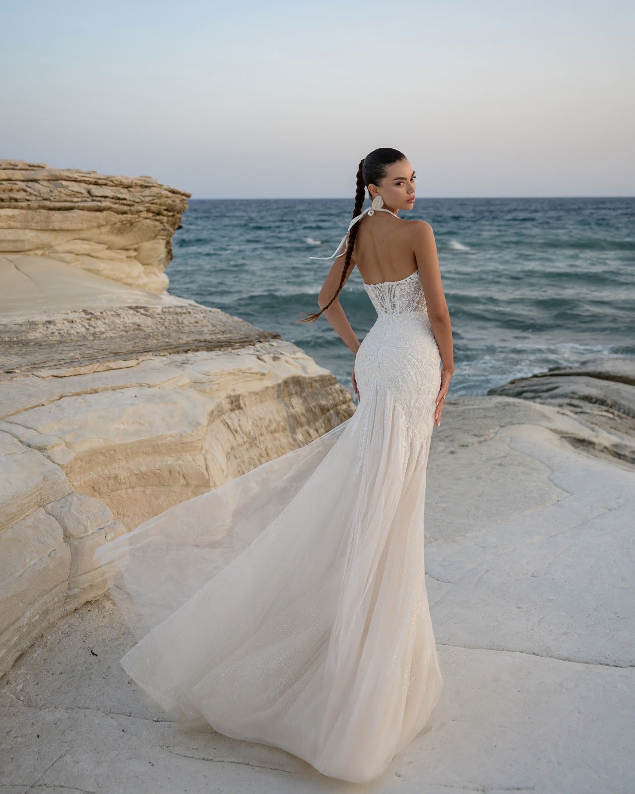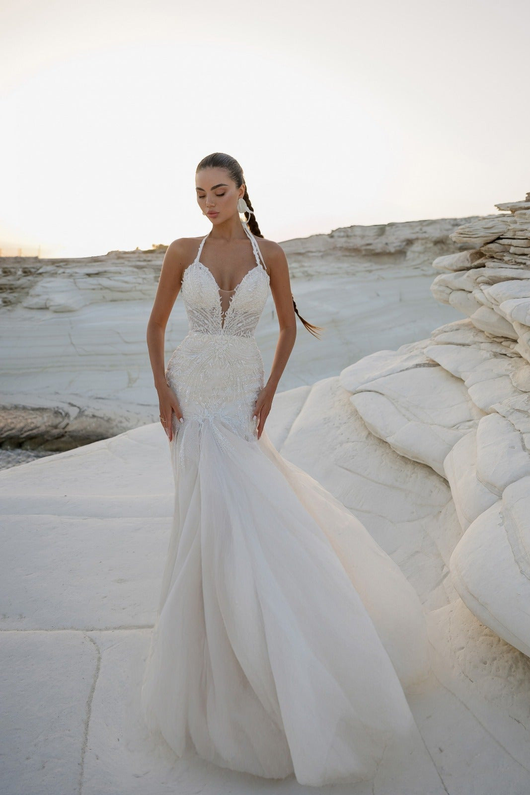 Un vestido de novia sirena que combina sensualidad, elegancia y delicadeza. Su encaje con pedrería y su escote estilizan la figura creando una silueta sofisticada y moderna. Perfecto para novias que buscan un look impactante y romántico.