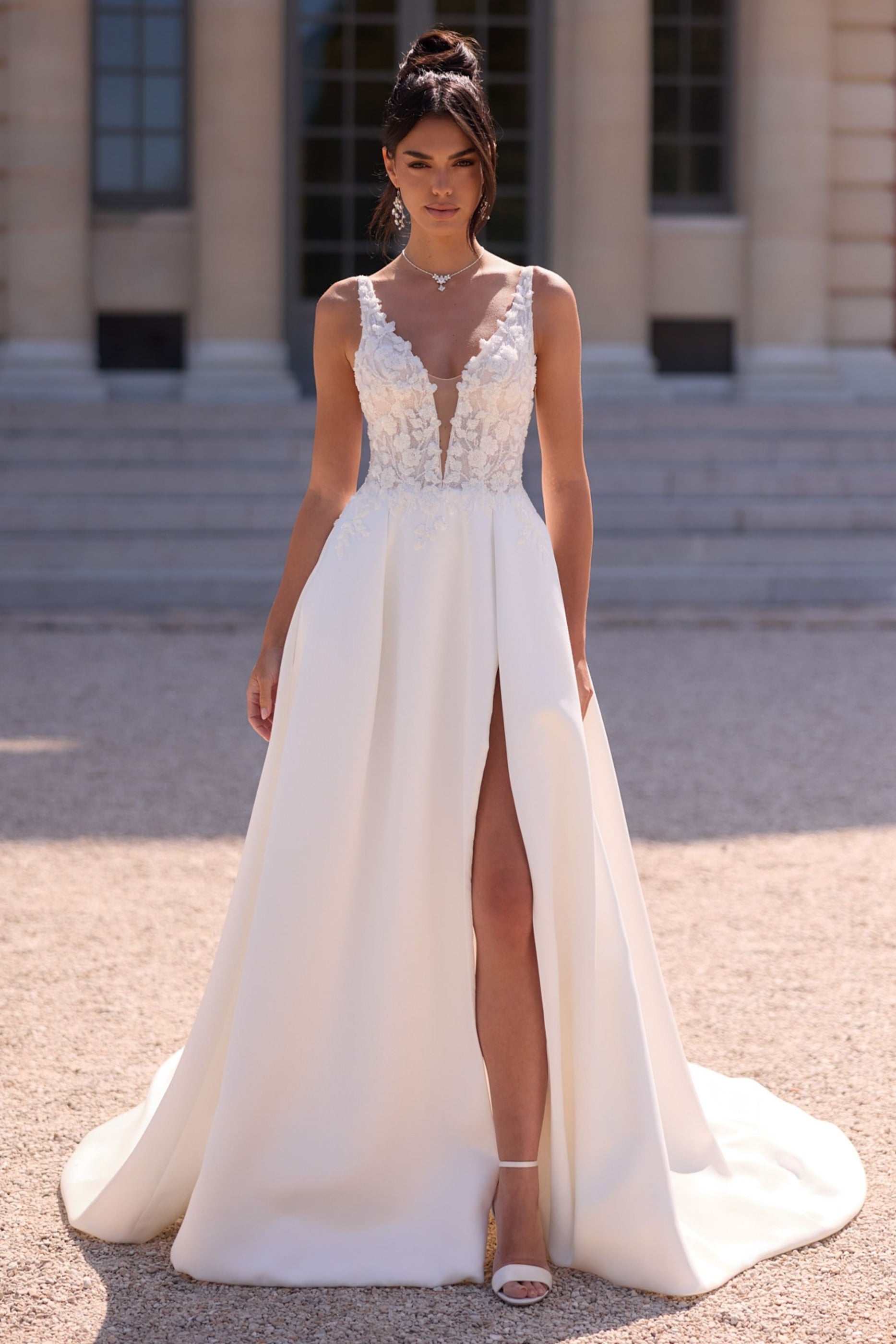 El vestido de novia Alexandra combina elegancia, sensualidad y ligereza en un diseño moderno con encaje y abertura frontal.