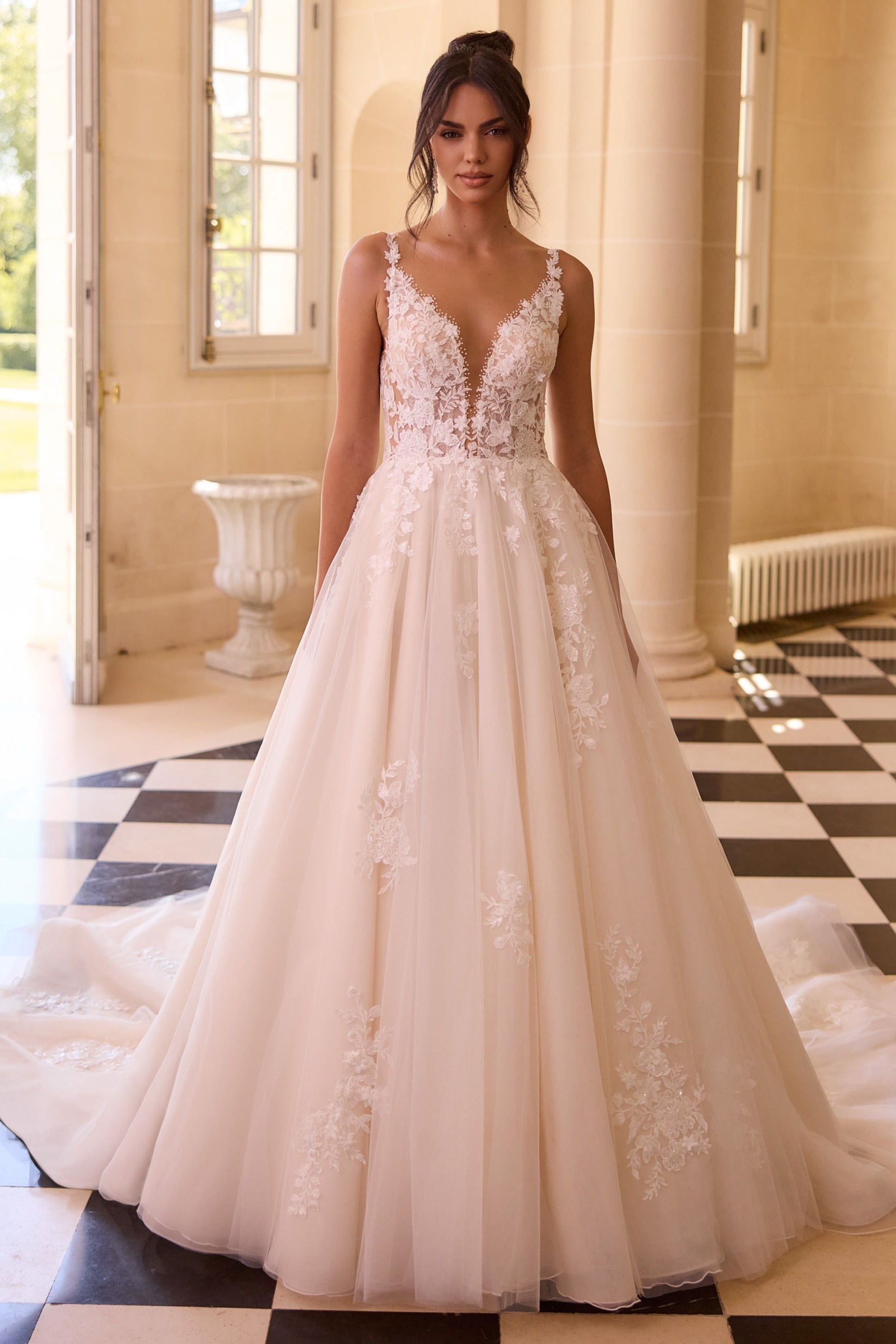 Descubre el vestido de novia AUSTRALIA, un espectacular diseño de corte princesa que te hará sentir como una reina en tu gran día. Con su silueta envolvente y elegante, este vestido realza tu figura de manera sublime, creando un efecto de cuento de hadas.