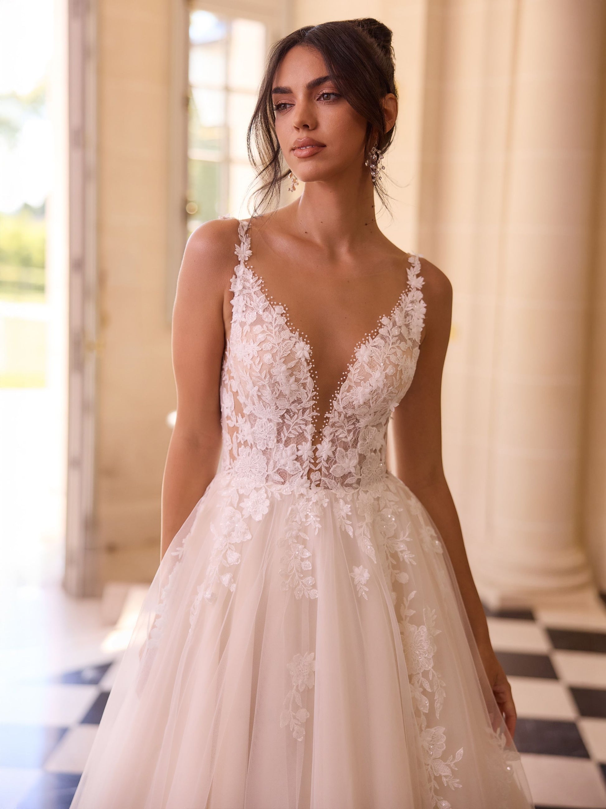 Vestido de novia confeccionado en encaje y tul de alta calidad.