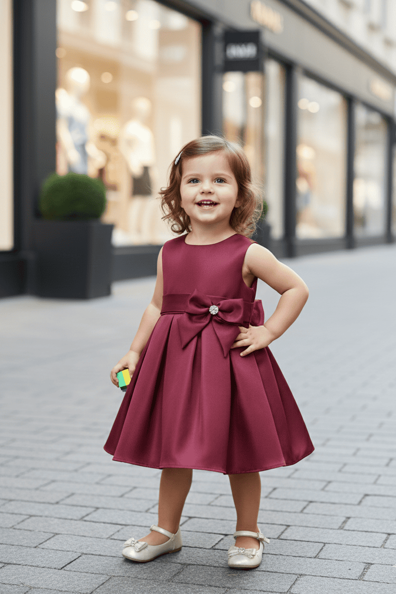 Este vestido de ceremonia burdeos para niña combina elegancia y diversión con su falda de tabla que aporta volumen y movimiento. Ideal para que las pequeñas luzcan radiantes y cómodas en cualquier evento especial, con un toque alegre y lleno de vida.